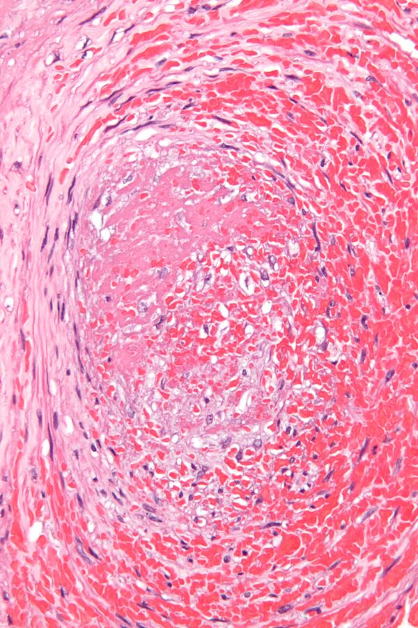 - Смешанные тромбы встречаются чаще всего. Они имеют слоистое строение — слоистый тромб — и пестрый вид, содержат элементы как белого, так и красного тромба. В смешанном тромбе различают головку (имеет строение белого тромба), тело (собственно смешанный тромб) и хвост (имеет строение красного тромба). Головка прикреплена к эндотелиальной выстилке сосуда, что отличает тромб от посмертного сгустка крови. Слоистые тромбы образуются чаще в венах, в полости аневризмы аорты и сердца.