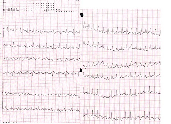 Признаки ТЭЛА на электрокардиограмме неспецифичны и у большинства больных отсутствуют[12]. Часто выявляют синусовую тахикардию, высокий и заострённый зубец P (P-pulmonale, признак перегрузки правого предсердия)[13]. Примерно у 20 % пациентов могут обнаруживаться признаки острого лёгочного сердца (перегрузки правого желудочка): отклонение электрической оси сердца вправо; синдром SIQIIITIII (синдром МакГинна-Уайта[14]) — глубокий зубец S в I отведении, выраженный зубец Q и отрицательный зубец T в III отведении; новая блокада правой ножки пучка Гиса; глубокие зубцы S в V5-6 в сочетании с отрицательными зубцами T в V1-4[15]. Однако острое лёгочное сердце может возникать и при других острых патологиях дыхательной системы (массивная пневмония, тяжёлый приступ бронхиальной астмы)[16].