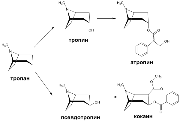 Наиболее известными представителями тропановых алкалоидов являются атропин, содержащийся в белладонне, скополамин (в дурмане семейства паслёновых) и кокаин (в коке семейства эритроксиловых).