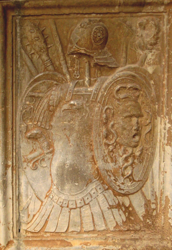 Композиция ещё может включать, помимо панциря с медальонами, набедренников и шлема — военные знамёна, знаки легиона, фасции (секиру и пучок ликторских прутьев), копья, мечи, венок и проч. В центре традиционно помещалось изображение Анкила (Ancile) — щита бога Марса. Не реже встречается сочетание с горгонейоном — изображением головы Горгоны Медузы, которая не только украшала эгиду богини Афины, но и считалась в античности мощным талисманом.