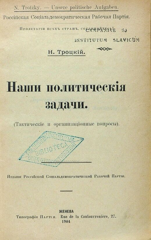 В 1904 году увидела свет брошюра Троцкого «Наши политические задачи» — ответ на работу Владимира Ленина «Шаг вперед, два шага назад»[20][21]. Она является первой относительно крупной работой автора; была направлена против партийного раскола в РСДРП, в котором обвинялся Ленин. Брошюра содержит как «критику и опровержение» ленинских идей, так и уничижительные эпитеты в адрес большевистского лидера[22][23][24]; в ней Троцкий, считая необходимым привлечь в революционное движение рабочих, а не профессиональных революционеров, выступил со своей концепцией партийного «централизма», отличной от ленинского «заместительства»[25][26].
