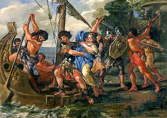 Парис отдал предпочтение богине любви, потому что та пообещала ему любовь прекраснейшей в мире женщины, супруги спартанского царя Менелая Елены. Парис отплыл в Спарту на корабле, построенном Фереклом. Менелай радушно принял гостя, но вынужден был отплыть на Крит, чтобы похоронить своего деда Катрея. Афродита влюбила Елену в Париса, и та отплыла с ним, взяв с собой сокровища Менелая и рабынь Эфру и Климену. По пути они посетили Сидон.