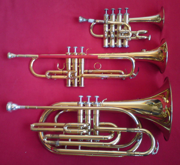 - Труба-пикколо (малая труба). Разновидность, сконструированная в конце XIX века, в настоящее время переживает новый подъём в связи с возродившимся интересом к старинной музыке. Используется в строе си-бемоль (in B) и имеет возможность перестройки в строй ля (in A) для диезных тональностей. Звучит на октаву выше обычной трубы, так как длина её канала короче в два раза[16]. В отличие от обычной трубы, имеет четыре вентиля. С трубой-пикколо используют мундштук с уменьшенным размером чашки, чтобы было легче брать ноты верхнего регистра. Среди выдающихся исполнителей на малой трубе — Уинтон Марсалис, Морис Андре, Хокен Харденбергер.