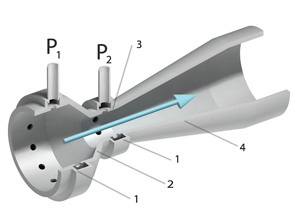 Трубка Вентури состоит из входного конуса конфузора (2), горловины (3) и диффузора (4). Для выравнивания давления на периферии горловина и входной конус имеют кольцевые усредняющие камеры (1), в нижней части которых устанавливают приспособления для спуска жидкости. Если конечный диаметр диффузора меньше диаметра трубопровода, то труба называется короткой, если равен — длинной. Отводы от трубы подключают к дифференциальному манометру. Расход определяется выражением: