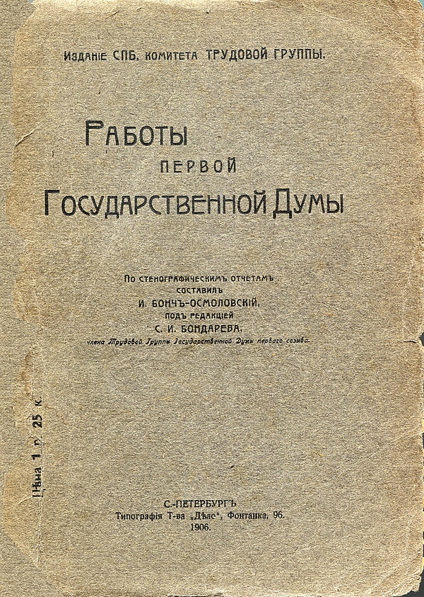 - И. Бонч-Осмоловский (под редакцией С. И. Бондарева, члена трудовой группы Гос. Думы первого созыва), «Работы первой Гос. Думы» (СПб., 1906);