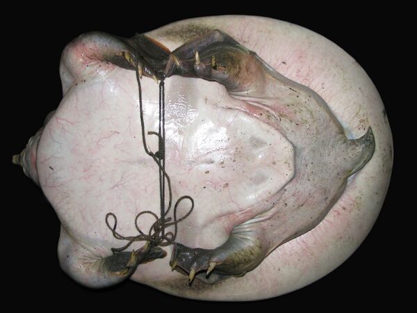 На каждой ноге — по три острых когтя на внутренних пальцах. Шея очень длинная. Роговые челюсти прикрыты своеобразными «губами» — толстыми кожистыми выростами. Конец морды вытянут в мягкий подвижный хоботок, на конце которого расположены ноздри.