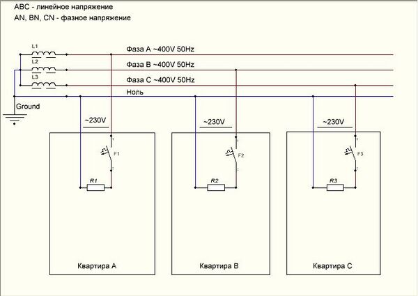 Кроме фазных проводников в сетях до 1000 вольт применяется нейтральный провод (N - "нейтраль" или "ноль"). Он позволяет использовать трехфазную сеть для питания однофазной нагрузки фазным напряжением.