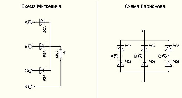 По схемам выпрямителей можно видеть, что выпрямитель Миткевича В. Ф. является «недостроенным» выпрямителем Ларионова А. Н., а выпрямитель Ларионова А. Н. является «недостроенным» выпрямителем «три параллельных моста».