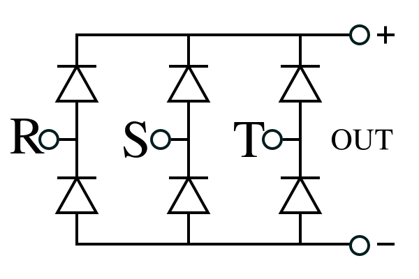 Трёхфазный выпрямитель «три двухфазных двухчетвертьмостовых параллельных выпрямителей Миткевича параллельно» (6 диодов)