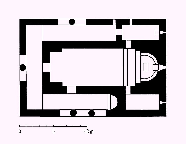 Внешне трёхцерковные базилики выглядят как обычные трёхнефные базилики, имеющие аналогичный контур, с высокой центральной секцией, покрытой двускатной крышей, и нижними боковыми секциями, каждая из которых покрыта односкатной крышей[2]. Однако, в отличие от обычной трёхнефной базилики, заканчивающейся алтарной частью на восточной стороне и имеющей приделы с северный и южной сторон, трёхцерковные базилики проектировались так, что не имели прямого сообщения между центральным нефом и боковыми приделами, за исключением притвора в западном конце или одной двери, ведущей из центрального нефа во вспомогательное помещение, образованное приделами. Приделы зачастую делались полуоткрытыми из-за того, что центральные секции северной и южной внешних стен заменялись на сводчатые аркады[1].