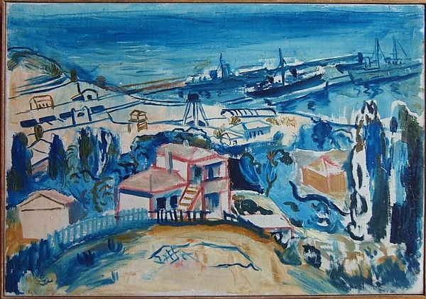 На картине изображён прибрежный пейзаж. На переднем плане — холм с небольшими домиками, за ними видны голубые деревья. Далее, на берегу, разбросаны низкие строения. Вдали от берега в море уходит мол, у которого стоят морские судёнышки.