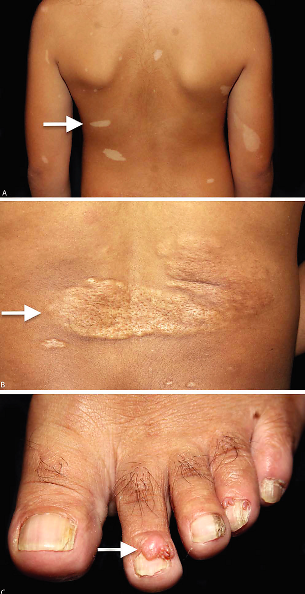 - Гипопигментированные пятна — наиболее распространённое кожное проявление, обнаруживаемое примерно у 90 % больных в виде светлых участков кожи. Фиброзные цефалические бляшки чаще всего локализуются на лбу, но могут появляться на любом участке лица или волосистой части головы, представляя собой гладкие или бугристые образования телесного, розового, красного или коричневого цвета. Ангиофибромы лица встречаются у 75 % пациентов и обычно располагаются по типу «бабочки» в скуловой области. Фибромы также часто встречаются и могут появляться после травм, причём около 90 % из них локализуются на пальцах ног[6].