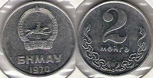 - 1970, 1977, 1980, 1981 (1-5 мунгу — алюминий, 10-50 — медно-никелевый сплав). Прежние монеты были изъяты из обращения.