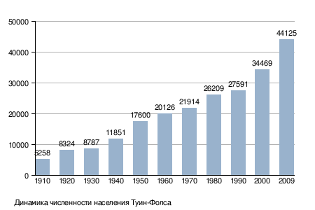 На 2010 год население Туин-Фолса составляло 44 125 человек[9]. С 2000 года рост населения составил 28,0 %[9]. Плотность населения составляет 1027 чел./км². Средний возраст жителей — 39 лет и 11 месяцев[10]. Половой состав населения: 48,7 % — мужчины, 51,3 % — женщины. Расовый состав населения по данным на 2010 год[9]: