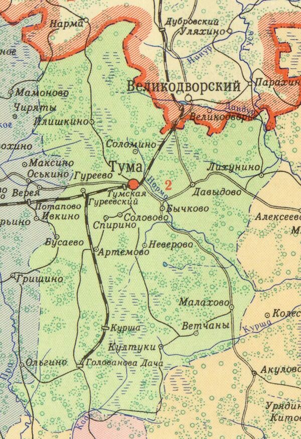 В окрестностях Тумы также располагаются многочисленные затерянные в лесах бывшие станционные посёлки и лагеря НКВД, память о которых сохранилась в названиях населённых пунктов — Первое Мая, Чарусский, Оборона, Лубяники. Рядом с посёлком Голованово находятся остатки печально известного посёлка Курша-2, в котором в результате пожара летом 1936 года погибло 1200 человек.