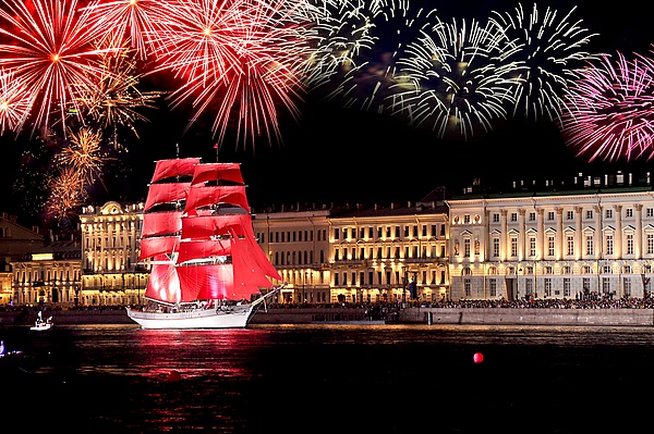 «Алые паруса» — всероссийский праздник выпускников, традиционно состоящий из концерта на Дворцовой площади и грандиозного водно-пиротехнического шоу в акватории Невы. В последние годы формат мероприятия менялся в зависимости от эпидемиологической обстановки. В 2020 году из-за пандемии COVID-19 праздник прошёл без зрителей в телевизионном формате, а основное действие было перенесено в Финский залив[14][15]. В 2021 году мероприятие вернулось в очный формат, но с допуском на основные площадки только для выпускников[16]. В 2022—2024 годах праздник проходил в традиционном формате с концертом для выпускников и открытым для всех желающих водно-пиротехническим шоу[17]. В 2025 году праздник прошёл в ночь с 28 на 29 июня[18].