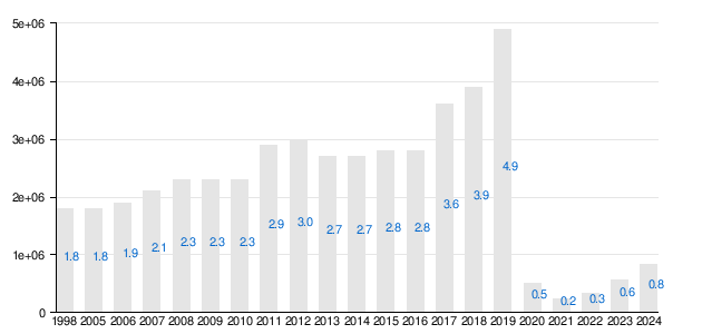 | 1,8 млн | 1,8 млн | 1,9 млн | 2,1 млн | 2,3 млн | 2,3 млн | 2,3 млн | 2,9 млн | 3,0 млн | 2,7 млн | 2,7 млн | 2,8 млн | 2,8 млн | 3,6 млн | 3,9 млн | 4,9 млн | 0,5 млн | 0,2 млн | 0,3 млн | 0,6 млн | 0,8 млн |