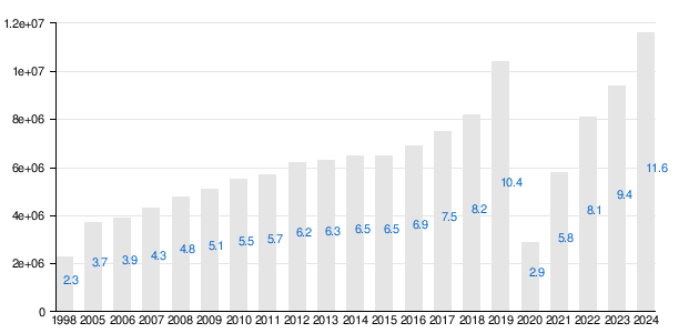 В 2024 году Санкт-Петербург посетили рекордные 11,6 млн туристов, что на 23 % больше, чем в 2023 году, и на 1,1 млн человек превысило допандемийный показатель 2019 года. Годом ранее, в 2023 году, город принял 9,4 млн гостей[40][41], а в 2022 году — более 8 млн[42][43]. Допандемийный рекорд 2019 года составлял 10,4 млн человек[44][45].
