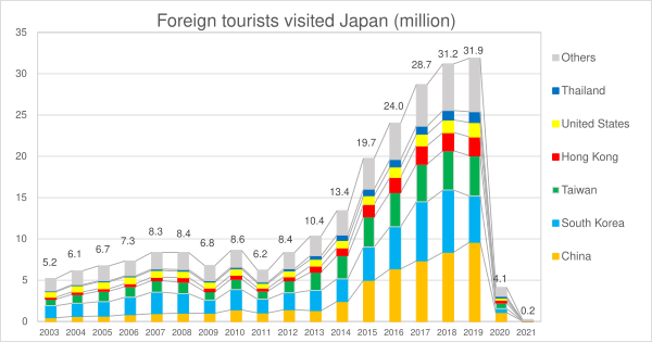 За весь 2024 год Японию посетило около 36,87 миллиона туристов, что на 47,1 % больше, чем годом ранее, и почти на 5 миллионов превышает предыдущий рекорд в 31,88 миллиона, установленный в 2019 году. Ожидается, что в 2025 году число посетивших Японию туристов превзойдет рекорд 2024 года в 36,87 млн человек[4].