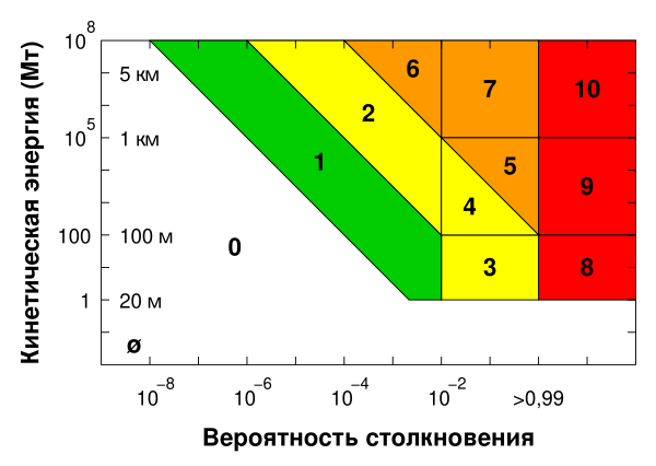 | 0. | Вероятность столкновения нулевая, или настолько низкая, что может считаться нулевой. Это также относится к небольшим объектам таким, как, например, метеоры и тела, которые сгорают в атмосфере, и к редким метеоритам достигающим поверхности, но редко вызывающим ущерб. |