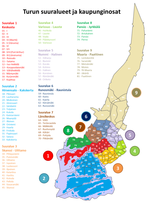 Река Аурайоки, одна из крупнейших в Финляндии, делит город на две части — северную и южную. Берега связывают семь мостов. В нижнем течении реки, там где мост мешал бы судоходству, переправу пешеходов и велосипедистов осуществляет бесплатный паром «Фёри» (фин. Föri).