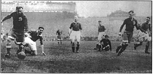 Матч начался. Сразу же после стартового свистка советские футболисты навязали хозяевам стремительный темп игры, и уже в первые две минуты голкипер Вудли трижды отбивал мяч, спасая свои ворота. Вскоре Архангельский попал в сетку с внешней стороны, а Бобров и Бесков потревожили перекладину. Отойдя от стартового натиска гостей, хозяева выровняли игру, на 18 минуте пушечный удар Лоутона в потрясающем прыжке парировал Хомич. На 23 минуте матча после розыгрыша углового Бейн выполнил прострельную передачу с левого фланга, Хомич успел к мячу, но Лоутон сумел выбить его из рук вратаря (и в тогдашнем СССР, и в нынешней английской лиге это было бы нарушением правил, но тогда стороны договорились играть по английским правилам тех лет) и перебросить подоспевшему Гоулдену, который отправил мяч в сетку. Отойдя от пропущенного гола, Бобров, получив мяч после розыгрыша штрафного, вышел один на один с голкипером Вудли, но с восьми метров пробил выше ворот.