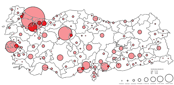 В Турции многие десятилетия проводилась политика отуречивания населения. Поэтому подсчитать численность этносов, даже приблизительно, бывает весьма затруднительно. По разным оценкам курдов в Турции от 10 до 23 % от общего населения страны[31]. 8,13 млн (данные Ethnologue на 2014 год[32]), и проживают они в больших количествах по всей территории страны, а в абсолютном большинстве на востоке.