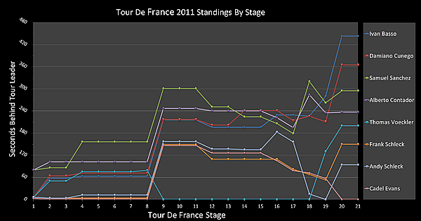 Главный фаворит «Тур де Франс» Альберто Контадор (Saxo Bank) оказался в группе догоняющих и уступил победителю 1 минуту 20 секунд[1].