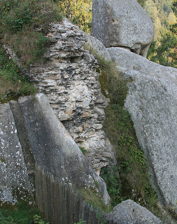 Скальные образования, сами по себе являющиеся мощными оборонительными стенами, были очень удачно использованы строителями. Промежутки между скалами были перегорожены деревянными стенами, закрывающими возможные подступы к замку. Там, где деревянные конструкции прилегали к скалам, в камне выдалбливали специальные углубления — пазы и врубы, чтобы закрепить бревна в скале. Эти следы позволяют воссоздать внешний вид крепости IX—XVI веков., несмотря на то, что самих деревянных конструкций уже давно не существует. Только на комплексе Камень таких следов наскальной застройки исследовано более 4000.
