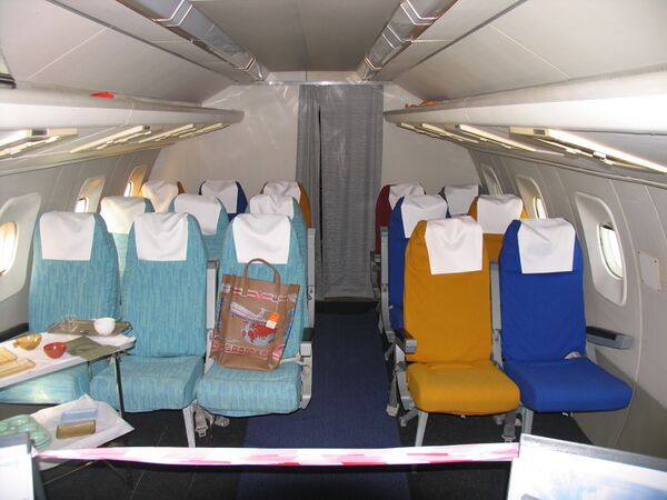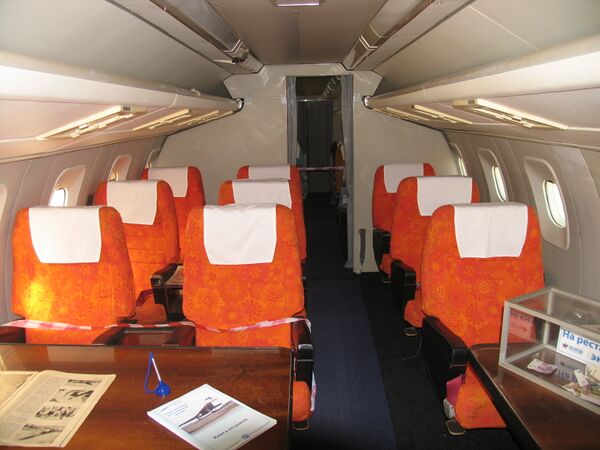 В центральной части расположена пассажирская кабина, которая вместе с носовой частью образует единый гермоотсек. Пассажирская кабина разделена на три пассажирских салона. Правый ряд имел блоки по три кресла, левый — по два, в хвостовой части третьего салона несколько рядов имели блоки по два кресла слева и справа. В первом салоне устанавливались сдвоенные кресла повышенной комфортности. На левом борту фюзеляжа были установлены две эксплуатационные двери для прохода в салоны. Также имелись служебные двери: две в хвостовой части фюзеляжа слева и справа, и по одной справа в середине и впереди. Для аварийного выхода на крыло имелось по люку справа и слева, также на некоторых машинах имелся слева внизу люк аварийного покидания для экипажа, сделанный как глухой тоннель сквозь передний грузовой отсек. В Монинском экземпляре такого тоннеля не было, и люк, открываемый снизу, даёт свободный доступ в передний грузовой отсек (впрочем, во многом заполненным нестандартным центровочным баком для авиакеросина).