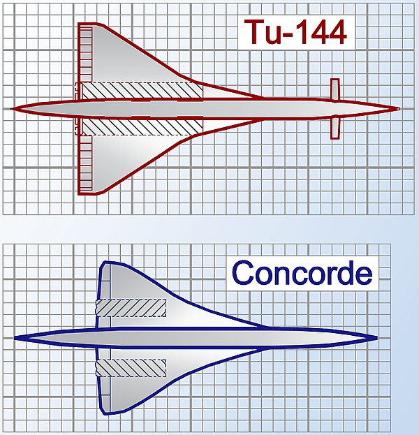 - Парные гондолы двигателей немного раздвинули (меньше, чем на Concorde), освободив от них фюзеляж, разгрузив его от нагрева и вибрации. Изменили нижнюю поверхность крыла в месте расчётной области поджатия потока, увеличили щель между ней и верхней губой воздухозаборника, что увеличило поджатие потока на входе в воздухозаборники на крейсерском режиме.