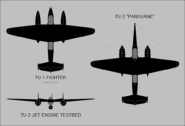 - Ту-2 «Параван» — построено два самолёта для испытания паравана — устройства, перерезающего тросы воздушных аэростатов.[8][9]