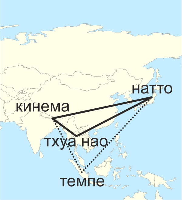 Японский этнобиолог Сасукэ Накао предположил, что натто, гималайская кинема и индонезийское темпе образуют вершины «треугольника несолёных ферментированных блюд из сои», заключив, что эти культуры вышли из китайской Юньнани[7]. В «треугольнике» Накао находятся также корейский чхонгукчан, пепок с севера Мьянмы, камбоджийский sieng, тайский тхуа нао[7]. Индийский пищевой технолог Джоти Пракаш Таманг исключал темпе из этого перечисления, так как его заквашивают грибком Rhizopus oligosporus, а остальные продукты — микроорганизмами рода Бациллы; вместо этого он предложил «треугольник кинема-натто-тхуа нао»[7].