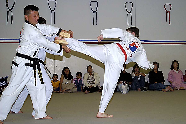 Тхэквондо означает систему духовной тренировки и технику самообороны без оружия, наряду со здоровьем, а также квалифицированным исполнением ударов, блоков и прыжков, выполняющихся голыми руками и ногами для поражения одного или нескольких соперников.