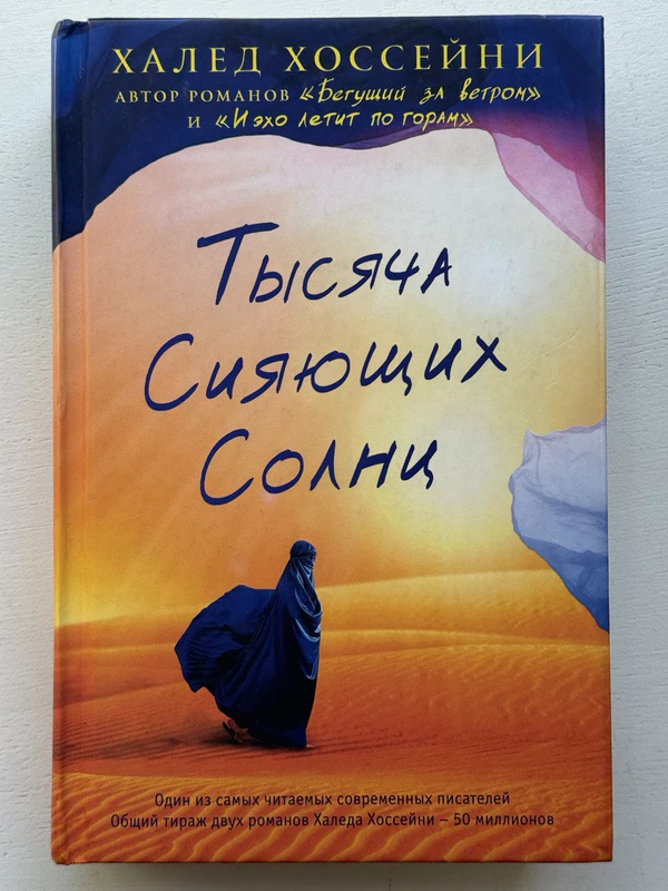 После завершения работы над „Бегущим за ветром“ я некоторое время вынашивал идею написать историю об афганских женщинах. В первом романе доминировали мужчины. Все главные герои, за исключением, пожалуй, жены Амира Сорайи, были мужчинами. Существовал целый пласт афганского общества, который я не затронул в „Бегущем за ветром“, целый пейзаж, который, как мне казалось, был богат сюжетными линиями… Весной 2003 года я поехал в Кабул и помню, как увидел этих женщин в парандже, сидящих на углах улиц, с четырьмя, пятью, шестью детьми, просящих мелочь. Я помню, как они парами шли по улице, за ними следовали их дети в лохмотьях, и задавался вопросом, как жизнь привела их к этому… Я разговаривал со многими из этих женщин в Кабуле. Истории из их жизней были поистине душераздирающими… Когда я начал писать „Тысячу сияющих солнц“, я снова и снова думал об этих стойких женщинах. Хотя ни одна из женщин, которых я встретил в Кабуле, не вдохновила на Лейлу или Мариам, их голоса, лица и невероятные истории выживания всегда были со мной, и в значительной степени вдохновением для этого романа послужил их коллективный дух[3].