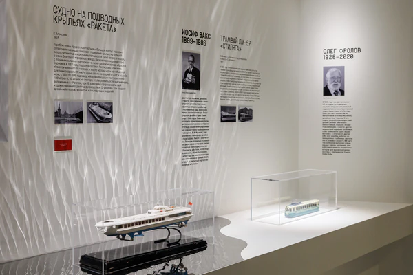 Среди экспонатов: модель Шаропоезда (ШЭЛТ), трамвай ЛМ-57 «Стиляга», судно на подводных крыльях «Ракета», макеты катамарана ОСГА-25, электропоезд «Иволга» (МЦД), автобус ЗИЛ-118 «Юность», автомобили «Аурус». Экспозицию дополняет фото- и видеохроника.