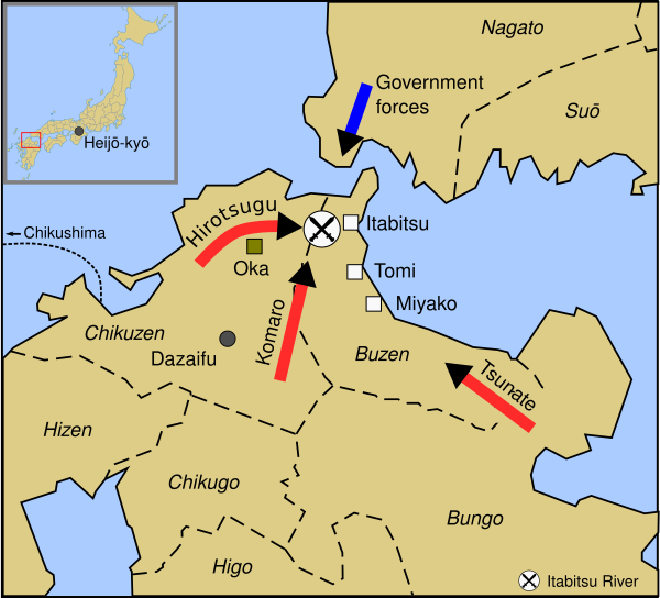 - 740 год (10-я луна 12-го года Тэмпё) — решительная победа над повстанцами; Фудзивара-но Хироцугу был обезглавлен в провинции Хидзэн[7];