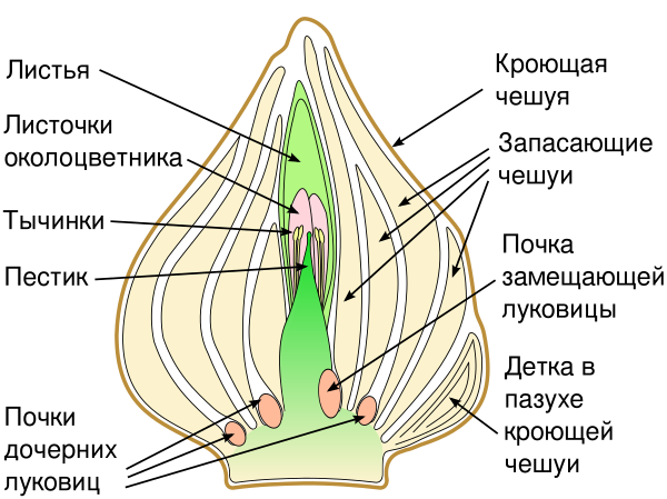 Срок жизни луковицы в природе обычно составляет 22 месяца, у садовых форм 24 месяца[37][38]. В первый год жизни она существует в виде почки внутри материнской луковицы. Год спустя, летом, материнская луковица усыхает и умирает, а заложенные в ней почки развиваются в полноценные луковицы. Главная (центральная) молодая луковица называется замещающей, луковицы, развивающиеся из других почек в пазухах запасающих чешуй — дочерними, а мелкие луковицы, развивающиеся в пазухах кроющей чешуи — детками. У многих видов их развитие подавлено: растение отдаёт все ресурсы единственной замещающей луковице[39]. У культурных сортов, отобранных по критерию скорости вегетативного размножения, дочерние луковицы развиваются почти наравне с замещающей, а коэффициент размножения превышает 3. Летом и осенью внутри молодой луковицы развивается зачаток будущего зелёного побега и цветка, и закладываются почки будущих луковиц. Перезимовав, луковица цветёт, закладывает луковицы нового поколения и погибает.