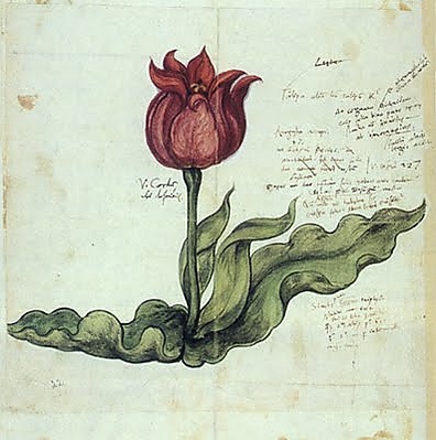 Первые тюльпаны Западной Европы были высажены в 1530 году в Португалии[215]. Интродукция осталась незамеченной. Четверть века спустя, в 1550-е годы, тюльпаны появились в Северной Европе. В апреле 1559 года Геснер наблюдал в Аугсбурге цветущий красный тюльпан, который по мнению современных ботаников принадлежал к виду тюльпан Шренка[216][217]. По рассказу Геснера, хозяин тюльпана вырастил его из семени, привезённого из Стамбула или из Каппадокии[218]. В 1562 году, по сообщению Клузиуса, луковицы из Стамбула привезли морем в Антверпен[219]. В популярной литературе укоренилось мнение о том, что аугсбургские и антверпенские тюльпаны были выращены из луковиц, которые прислал в Европу фламандский дипломат де Бусбек, живший в Турции в 1554—1562 годы[220]. Однако тюльпаны, описанные им в 1555 году, не имели запаха: вероятно, это были не тюльпаны Шренка, но сложные садовые гибриды[221][комм. 8]. По мнению современных авторов (Паворд, Голдгар, Кристенхуз и соавторы), роль Бусбека в интродукции тюльпанов отнюдь не очевидна, а происхождение аугсбургских тюльпанов доподлинно не известно. Вероятно, к 1559 году торговля луковицами шла уже несколько лет (о ней упоминает Пьер Белон, посетивший Турцию в 1540-е годы), но оставалась незамеченной европейскими ценителями восточных редкостей[223]. Важнейшую роль[224] в объединении торговцев, цветоводов и их титулованных покровителей сыграл Карл Клузиус — директор Венского ботанического сада (1573—1587) и профессор Лейденского университета (1593—1609). Благодаря ему луковицы, поступавшие из Османской империи в сопредельную Австрийскую, быстро распространились по Европе[225]; луковицы, украденные из его тщательно охранявшейся лейденской коллекции, послужили основой голландского фонда сортов[226]. Именно Клузиус ввёл в научный оборот, взамен архаичного Lilionarcisssus, использованное Геснером название Tulipa, и первым разделил его виды в зависимости от сроков цветения[227].