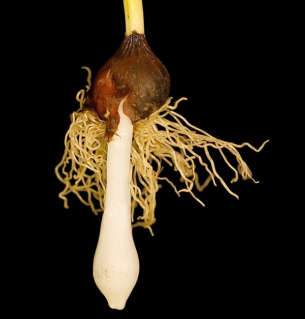 В течение нескольких дней после пробуждения зародыш, питаясь накопленными в семени запасами, увеличивается в размерах. Затем оболочка семени трескается. Нижний, корневой, конец семядоли выходит из защитной оболочки и углубляется в почву; верхний конец остаётся внутри оболочки и служит своего рода упором для нижнего[130]. Через 10—12 дней после прорастания семядоля углубляется в почву на 2,5—6 см[131], и на её корневом конце начинает развиваться единственный, главный настоящий корень[132]. В это же время трогается в рост и надземная часть семядоли — белёсый, лишённый хлорофилла волосок диаметром не более 1 мм. Когда она достигает 5—6 см в высоту, её верхушка уплощается и зеленеет, сеянец сбрасывает оболочку семени, начинается активный фотосинтез. Предельная высота наземной части сеянца не превышает 10,5 см, предельная её толщина — не более 3 мм; более типичны значения в 6—8 см и 1—1,5 мм[131]. Настоящие надземные листья в первый вегетационный сезон не развиваются[133]. Единственная почка сеянца — будущая луковица с зачатками донца (модифицированного стебля) и запасающей чешуи (модифицированного листа) — закладывается ещё внутри непроросшего семени[134], а после прорастания развивается под землёй. В подземной, черешковой, части семядоли образуется вздутие, развивающееся в растущий вбок вырост с почкой на конце[135]. Затем этот вырост меняет направление роста и превращается в полый, заполненный воздухом[136], растущий вертикально вниз столон углубления — защитный покров почки. Столон заглубляет почку ещё на 1,5—5,0 см[131]. По достижении типичной для данного вида глубины, что занимает от 10 до 26 дней[137], углубление столона прекращается, и начинается рост почки в толщину. Крахмал, запасаемый стенками столона, перемещается в листовую часть почки. Она, утолщаясь, превращается в запасающую чешую, а стенки столона, отдав будущей луковице весь крахмал, становятся её покровной чешуёй[138]. Рост луковицы занимает от 24 до 36 дней[137] и завершается вскоре после отмирания надземной части семядоли и главного корня. Средняя масса луковицы первого года, в зависимости от вида, составляет всего от 20 до 120 мг[139]. Во второй половине лета луковица закладывает от 6 до 11 придаточных корней (отмерший главный корень более никогда не возобновляется) и два зачатка листьев — надземного зелёного и подземного запасающего[140]. Осенью, когда почва вновь пропитается дождевой водой, зелёный лист трогается в рост и выходит за пределы луковицы, но поверхности земли не достигает и остаётся зимовать в толще земли[141].