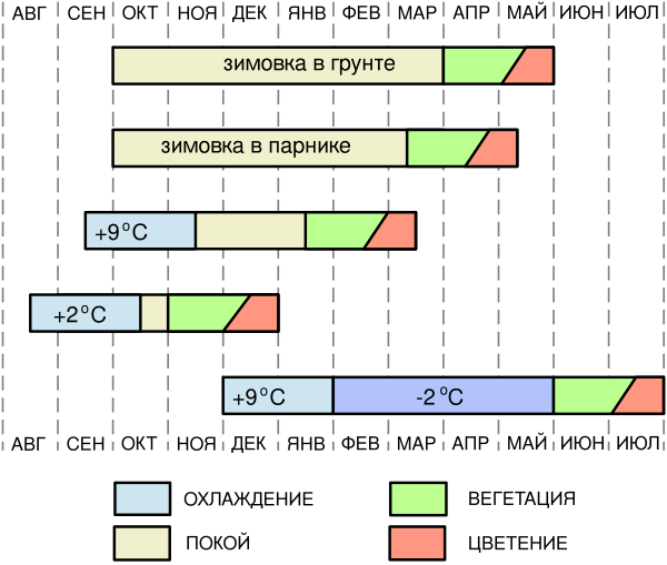 Для сдвига естественного срока цветения с мая на более ранние периоды (декабрь—апрель) практикуется несколько стратегий, применяемых в зависимости от выбранного срока цветения и реализации цветов[302]: