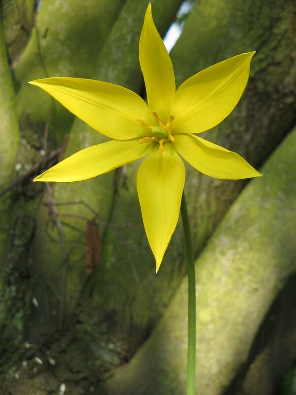 Начиная со второго года жизни, молодые тюльпаны всех видов формируют единственный настоящий лист. Полноценный же плодоносящий надземный побег с листьями, стеблем-цветоносом и цветком образуется только у зрелых растений[63][64]. Зачаток стебля внутри луковицы-почки закладывается ещё до того, как она обособится от материнской луковицы: например, у тюльпана Кауфмана срок жизни стебля составляет около 450 дней, из них примерно 200 дней занимает органообразование (март—сентябрь), 180 дней зимний покой (сентябрь—февраль), и лишь 75 дней — весенняя вегетация (март—май)[65]; у культурных сортов тюльпана Геснера закладка побега будущего года совпадает с началом развёртывания листьев текущего года и длится, как минимум, до сентября[66].