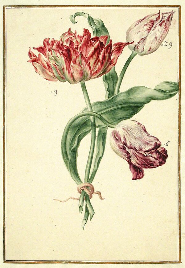 В начале XVII века выращивание тюльпанов, раньше считавшееся привилегией аристократов, стало модным увлечением голландских, английских и французских купцов-нуворишей, лишь недавно разбогатевших на торговле с колониями[228][229]. В угоду им цветоводы выводили первые сорта собственной, европейской селекции ('Duc van Tol', 1595[230]), а издатели печатали богато иллюстрированные книги о растениях — Florilegium Свеерта (1613), Hortus Eystettensis Беслера (1613) и другие. Центр доходного промысла обосновался во Франции[231]; здесь в начале века произошёл первый в европейской истории ажиотажный рост цен на луковицы[232]. В 1608 году французский мельник обменял свою мельницу на единственную луковицу; женихи считали такие луковицы завидным приданым[233]. Тюльпаны 1600-х годов обычно одноцветные, реже двуцветные. В 1610-е и 1620-е годы на первое место выдвинулись редкие ещё пестролепестные сорта, а центр торговли тюльпанов постепенно переместился в Голландию[234]. В 1634 году на голландских рынках началась тюльпаномания. В течение двух лет рынок разогревался спросом на редкие сорта. Весной 1636 года голландцы перешли к фьючерсной торговле асами (нидерл. azen) — условными единицами веса ещё не выросших луковиц. На рынок вышли массы непрофессиональных спекулянтов, и в зиму 1636—1637 года биржевые цены достигли апогея. С ноября 1636 года дорожали не только редкие сорта, но и обычные, одноцветные садовые тюльпаны[235]. В феврале 1637 года пузырь неожиданно лопнул[236]. В традиционном изложении Чарлза Маккея[237] тюльпаномания имела характер классического биржевого краха и надолго подорвала экономику страны[238]; современные критики эту трактовку отвергают. Голландское общество «кризиса» не заметило[239], а падение цен на луковицы ценных сортов не имело катастрофического характера[240]. Точная характеристика событий 1634—1637 годов затруднена из-за немногочисленности сохранившихся свидетельств.