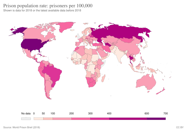 В абсолютном значении Соединённые Штаты Америки в настоящее время лидируют по числу заключённых; в этой стране свыше 2,19 млн[7], или более одного из каждых ста взрослых[8], находятся в заключении. Хотя население США составляет менее 5 % от мирового, порядка 20 % людей, находящихся за решёткой, приходится на американские тюрьмы.