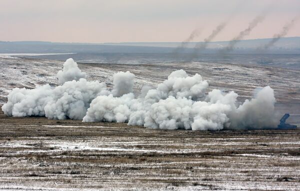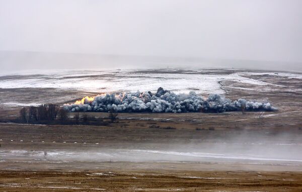 Стрельбы тяжёлой огнемётной роты ТОС-1А на учениях частей и подразделений РХБЗ на Шиханском полигоне