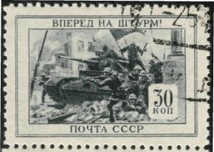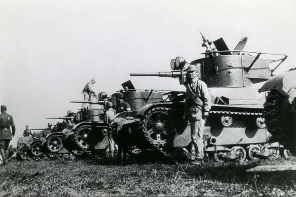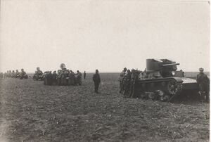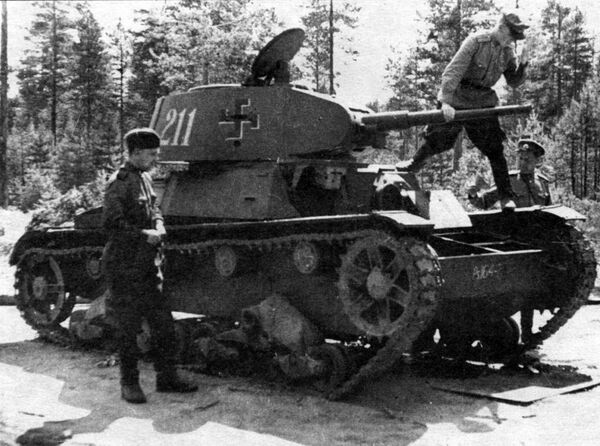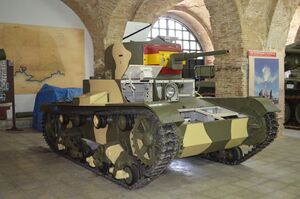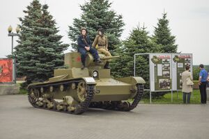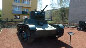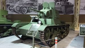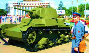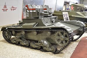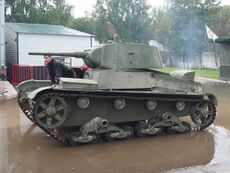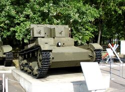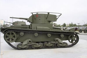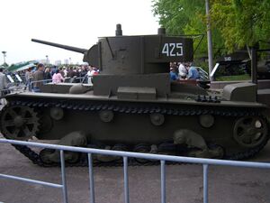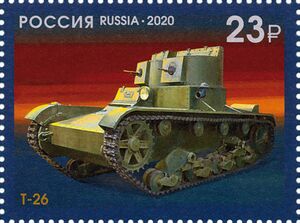 Т-26 — советский лёгкий танк. Cамый многочисленный танк Красной армии и финской армии к началу Великой Отечественной войны, а также армии Испанской Республики времён гражданской войны в Испании, второй по количеству выпущенных после Т-34 советский танк 1930-х — 1940-х годов[4]. Создан на основе британского танка Vickers Mk E (также известного как «Виккерс 6-тонный»), закупленного в 1930 году. Принят на вооружение в СССР в 1931 году.