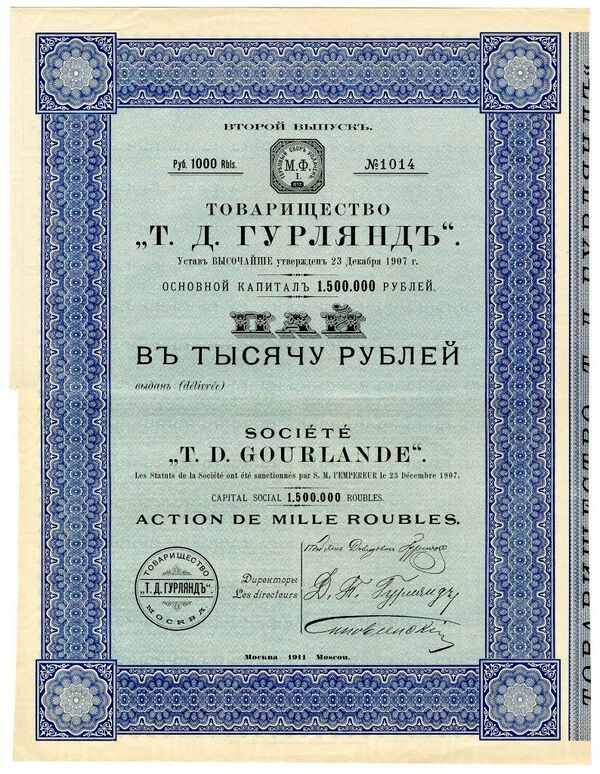 Первоначально Основной капитал Товарищества составлял один млн. руб, разделенный на тысячу паёв в 1000 руб. каждый, однако 2 мая 1911 г. Министерство торговли и промышленности Российской империи удовлетворило ходатайство Товарищества «Т. Д. Гурлянд» об увеличении данной суммы в полтора раза посредством дополнительной эмиссии пятисот паёв по 1000 руб[3].
