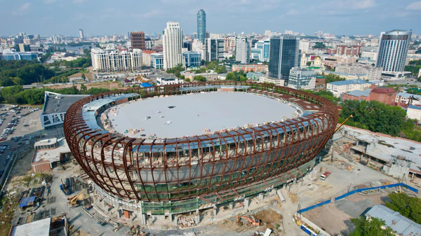 Из нескольких вариантов проекта окончательно выбран с оранжево-медным фасадом, а на крыше — огромный логотип УГМК[6]. Строительство велось за счёт бюджета Свердловской области[7][8].