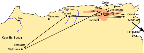 В Египте Абдуллах выдавал себя за купца. Его сторонники предлагали уехать в Йемен, но Абдуллах выбрал иной вариант. Покинуть Египет его вынудили активные действия аббасидских войск, вторгнувшихся в Египет для восстановления в нём власти халифа в 905 году. Абдуллах в составе купеческого каравана отправился на запад в Ифрикию, где больших успехов достиг исмаилитский да’и Абу Абдаллах аш-Ши’и, проповедовавший в этом регионе с 893 года. Добравшись до Триполи, Убайдаллах отправил посланца к Абу Абдаллаху, но он был арестован наместниками Ифрикии Аглабидами. После этого Абдуллах решил изменить маршрут и в составе купеческого каравана отправился в обход Ифрикии далее на запад в город Сиджильмаса, управлявшийся династией Мидраридов. Здесь он в 905 году поселился, по-прежнему выдавая себя за купца.