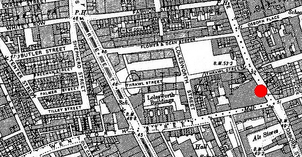 В три часа ночи окровавленный фрагмент передника Эддоус был обнаружен в дверном проёме дома № 108—119 по Гоулстон-стрит в Уайтчепеле — примерно в пятистах метрах от места убийства. Здесь же была обнаружена надпись, которая в полицейских документах была записана в двух вариантах[K 4]: The Juwes are the men that will not be blamed for nothing[K 3][116][117][118] или The Juwes are not the men who will be blamed for nothing[K 3][119][120]. В 5 часов утра комиссар Уоррен, присутствовавший на месте происшествия, приказал стереть слова из страха, что они разожгут антисемитские беспорядки[121][118][122]. Улица, на которой были найдены часть передника и надпись, располагалась прямо по маршруту от площади Майтр к Флауэр-и-Дин-стрит, где проживали обе жертвы[102].